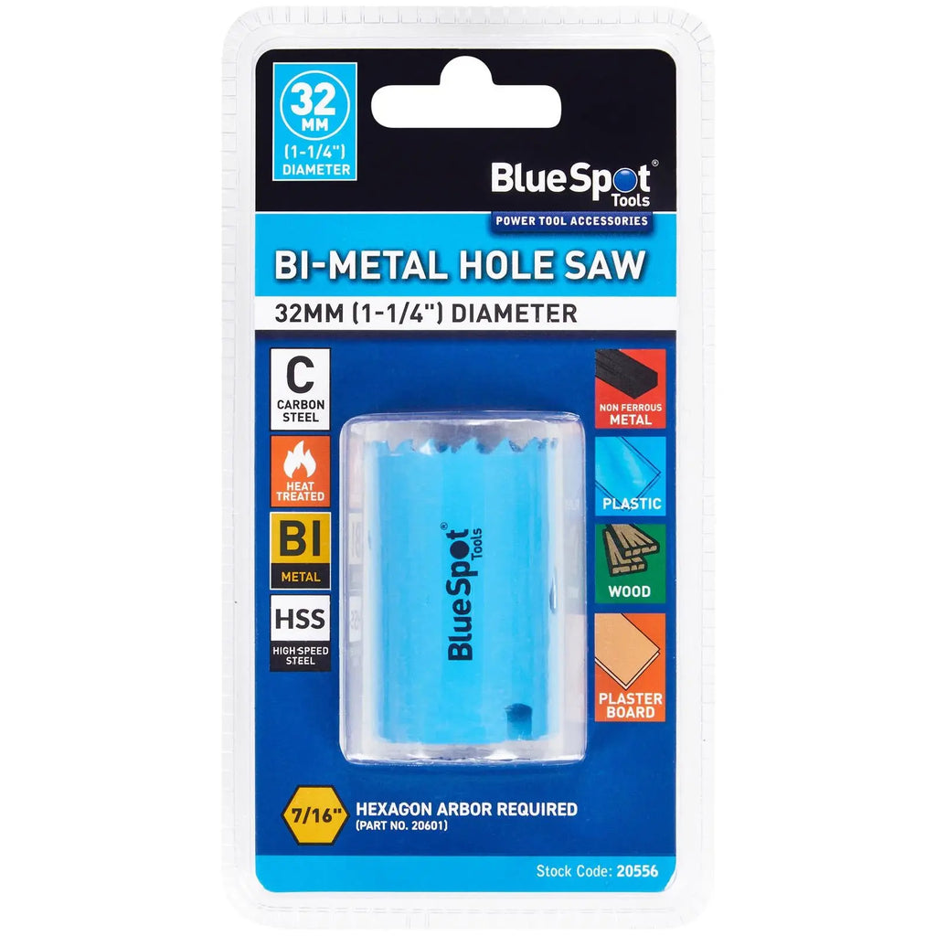 The BlueSpot Tools 32mm (1-1/4") bi-metal hole saw is ideal for cutting through non-ferrous metals, plasterboard, plastic and wood. Manufactured from heat treated high carbon steel for increased durability with HSS teeth for exceptional cutting power. Requires 7/16" hexagon arbor