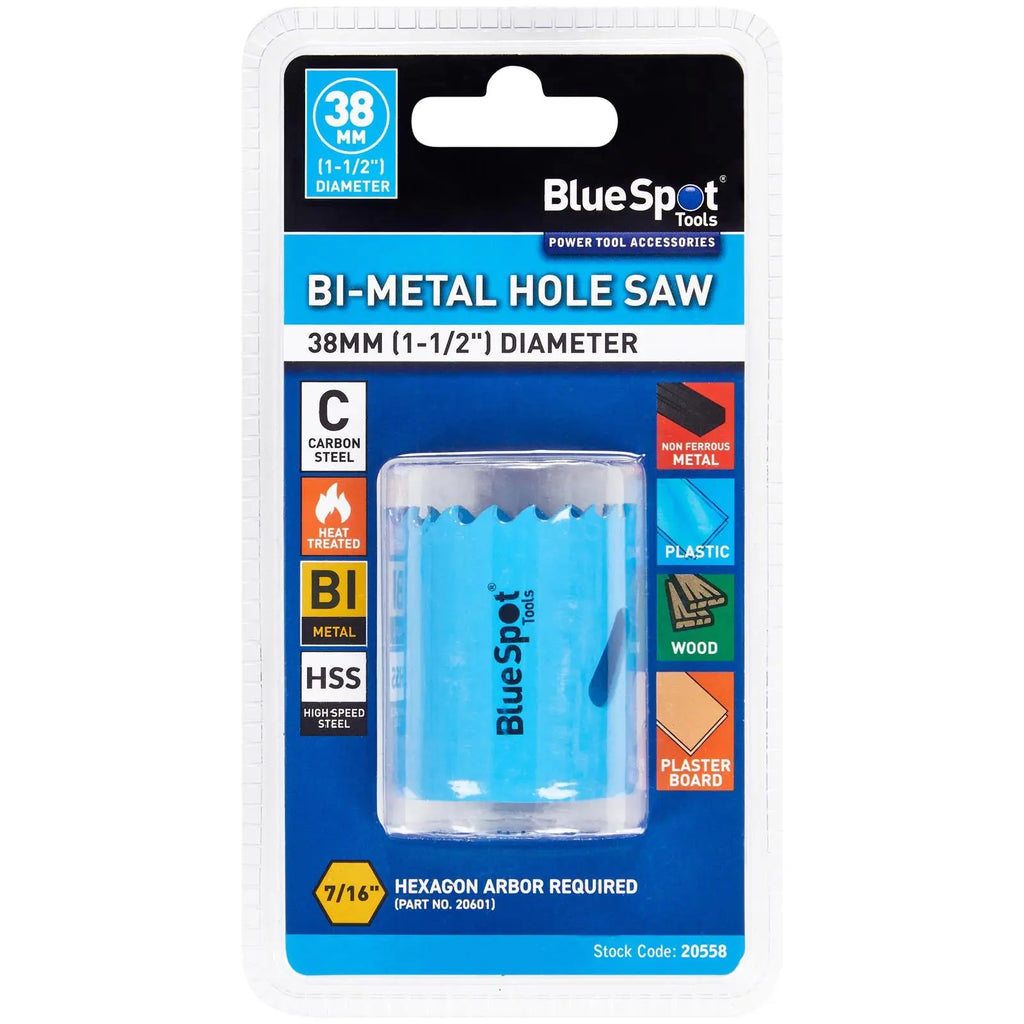 The BlueSpot Tools 38mm (1-1/2") diameter bi-metal hole saw is ideal for cutting through non-ferrous metals, plasterboard, plastic and wood. Manufactured from heat treated high carbon steel for increased durability with HSS teeth for exceptional cutting power. Requires 7/16" hexagon arbor
