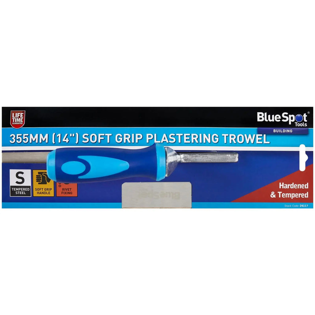 The BlueSpot Tools 355mm (14") Soft Grip Plastering Trowel is manufactured from hardened and tempered steel for increased durability. Features soft grip rubber handle for increased comfort. 5 rivet fixing for increased strength.