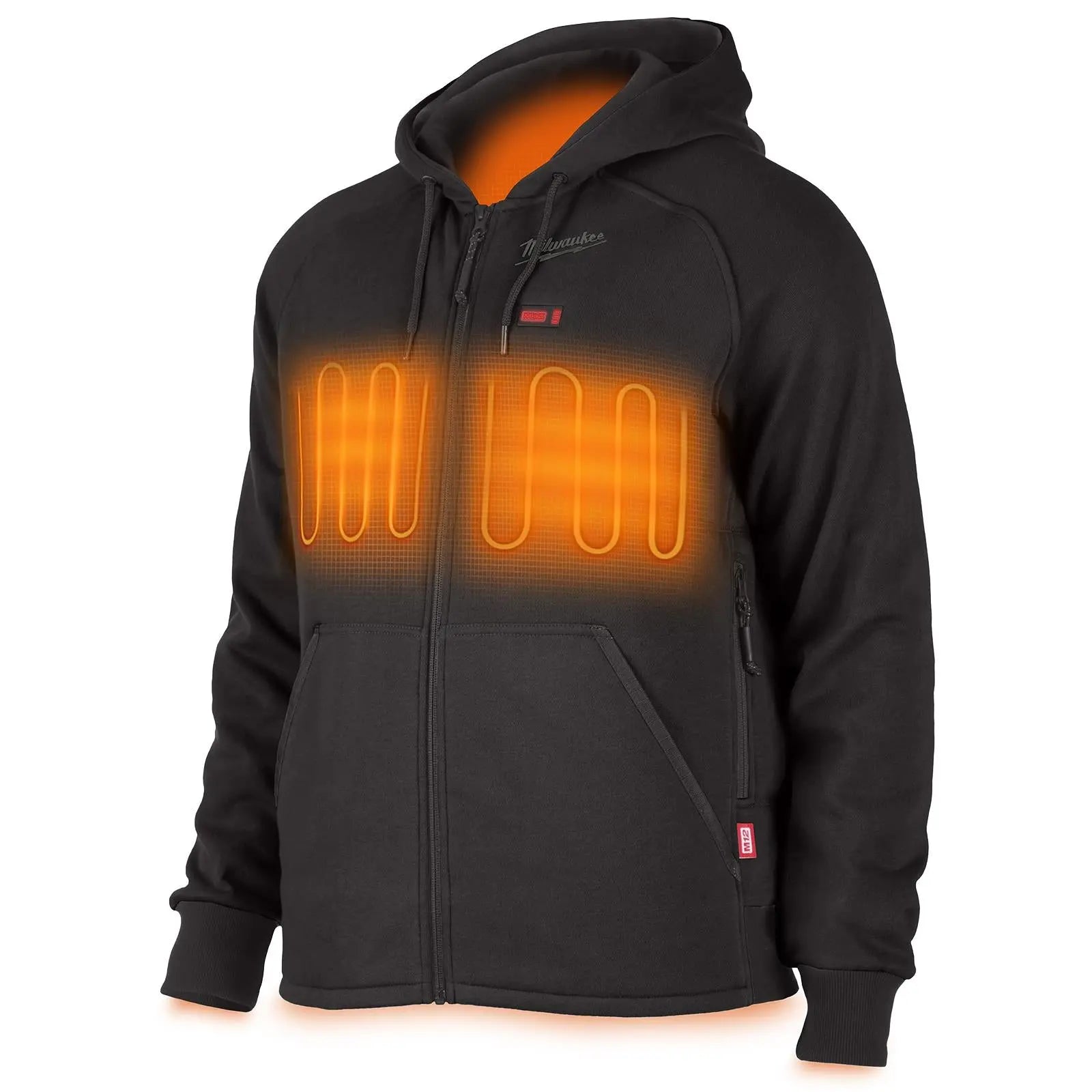 M12™ Heated Hoodie powered by an M12™ battery with carbon fibre heating elements creates and distributes heat to chest and back