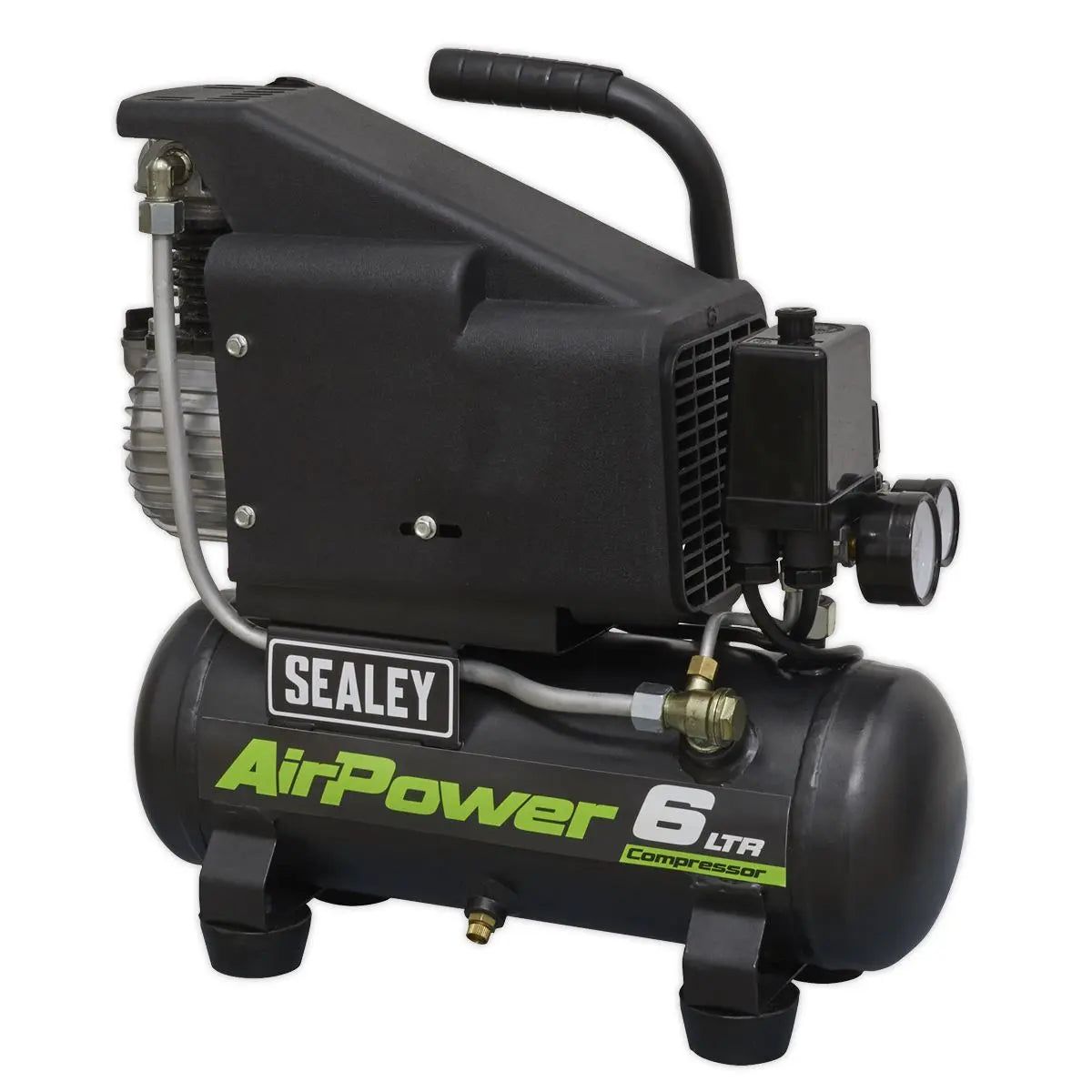 Model No. SAC0610E - 6L Direct Drive Air Compressor 1hp fitted with twin gauges displaying tank and working pressures. Maximum Free Air Delivery: 2.7cfm(76L/min). Maximum Pressure: 116psi(8bar).