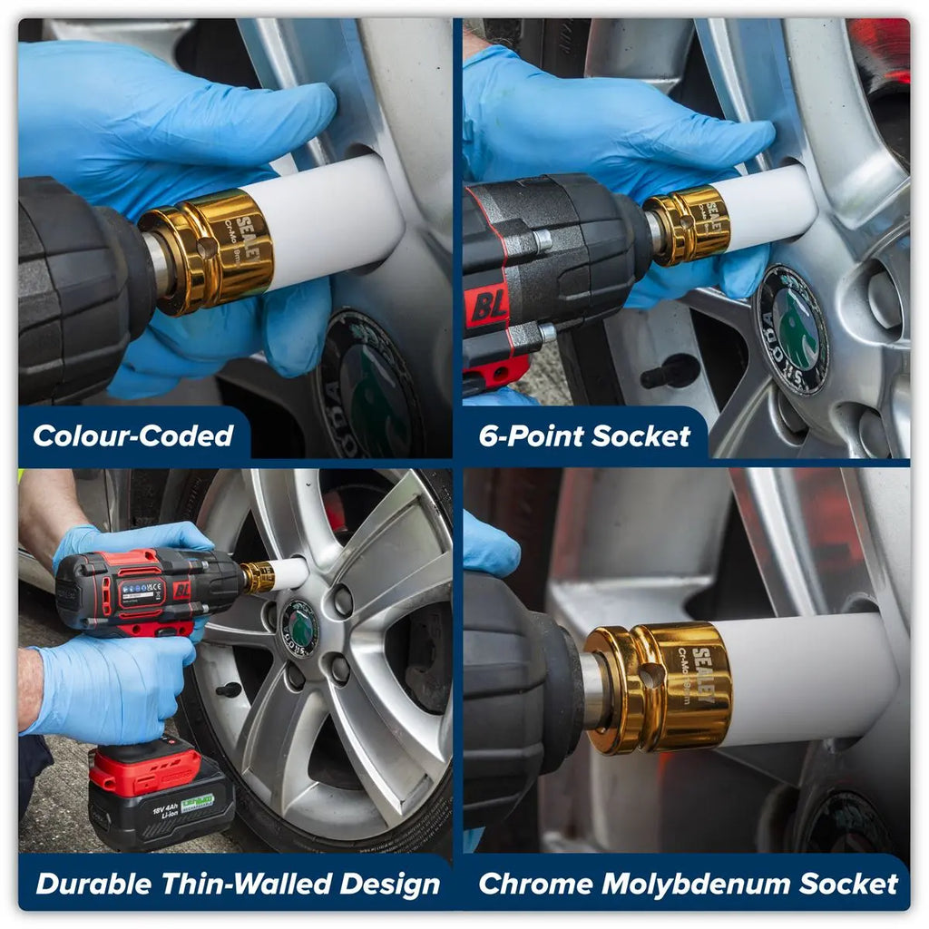 COLOUR-CODED - For easy size selection. IMPORTANT INFORMATION Alloy wheel impact sockets have an ultra-thin-walled design permitting a limited torque range. They are suitable only for wheel nuts and exempt from a lifetime guarantee.