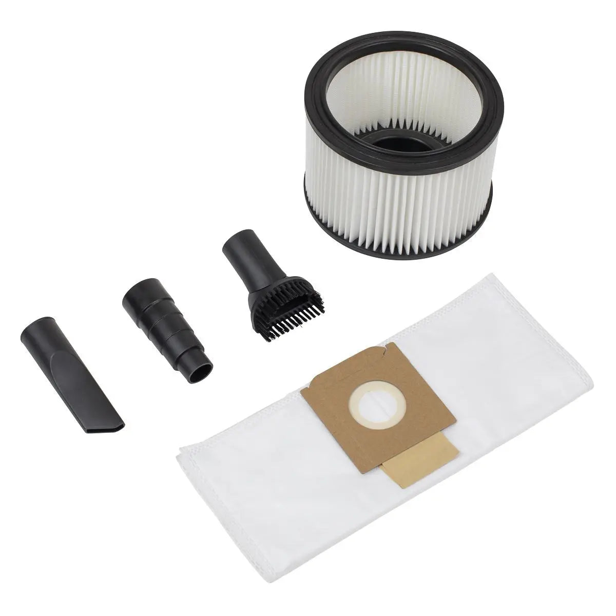 ACCESSORIES - Fitted with 5m cable and 1.5m suction hose. Supplied with three aluminium extension tubes, cartridge filter, wet-use foam filter, dust collection bag, power tool adapter, floor brush, crevice tool and round brush.