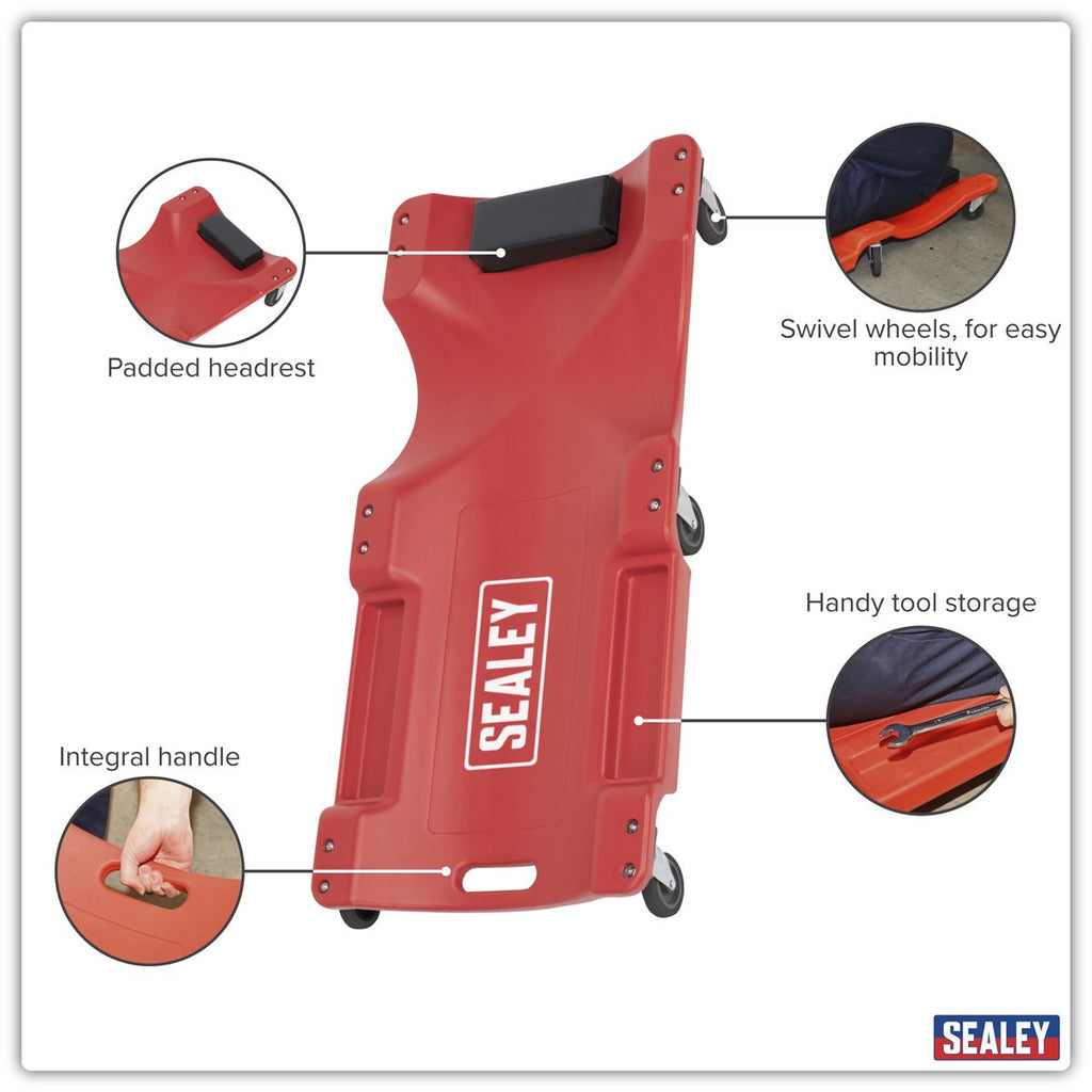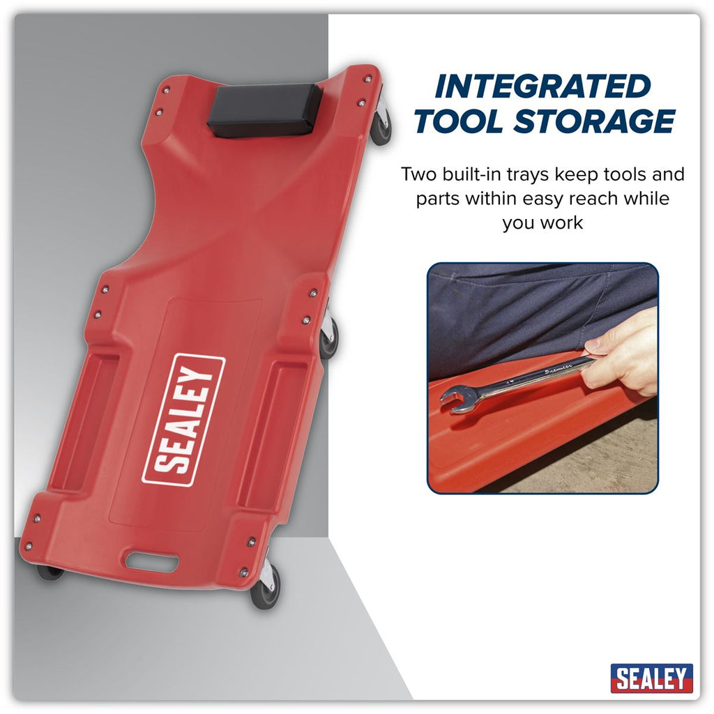 One-piece, moulded, high-impact, polymer creeper with two integral tool trays and padded headrest.