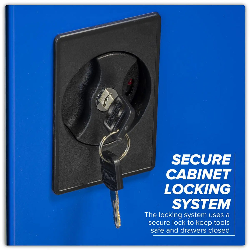 Industrial quality double door freestanding locker cabinet with three shelves and seven drawers.