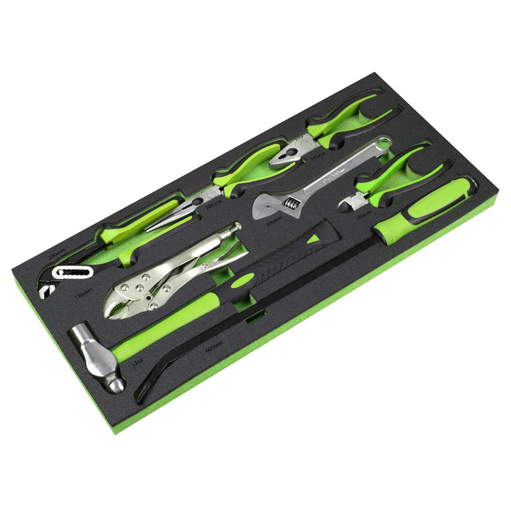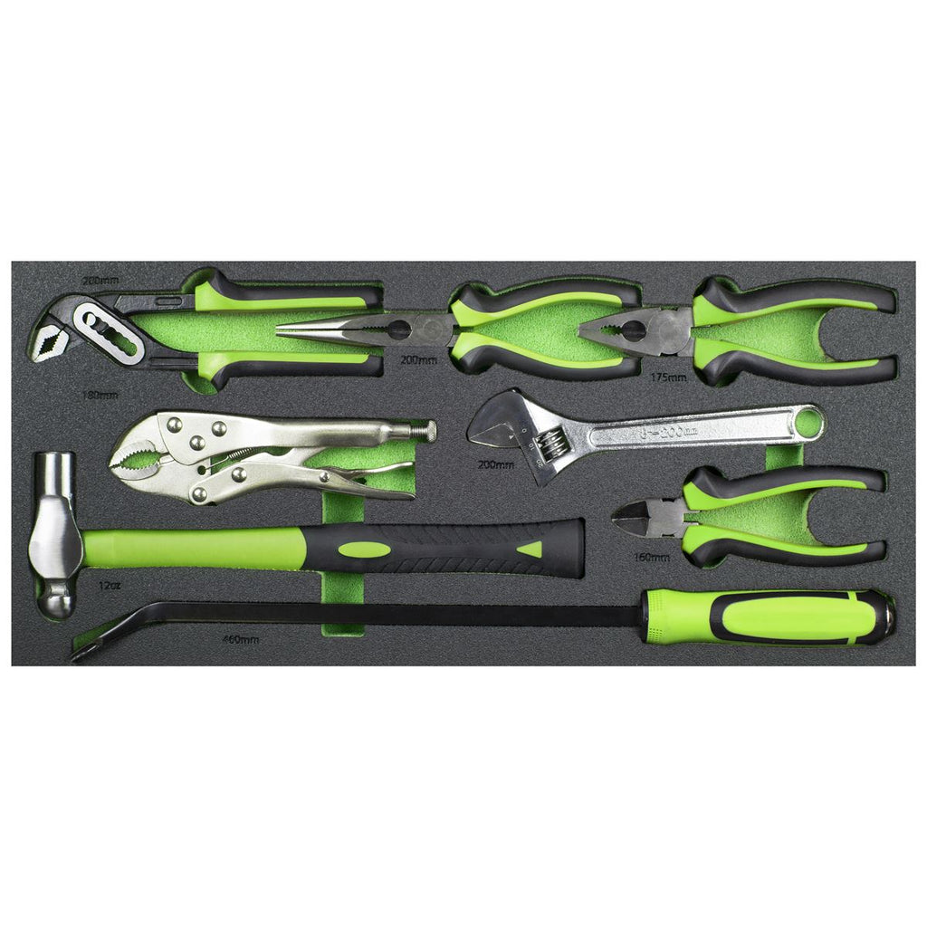 - Drawer 4: 200mm Adjustable Wrench, 200mm Water Pump Pliers, 200mm Long Nose Pliers, 175mm Combination Pliers, 160mm Side Cutters, 180mm Locking Pliers, 12oz Ball Pein Hammer, 460mm Pry Bar