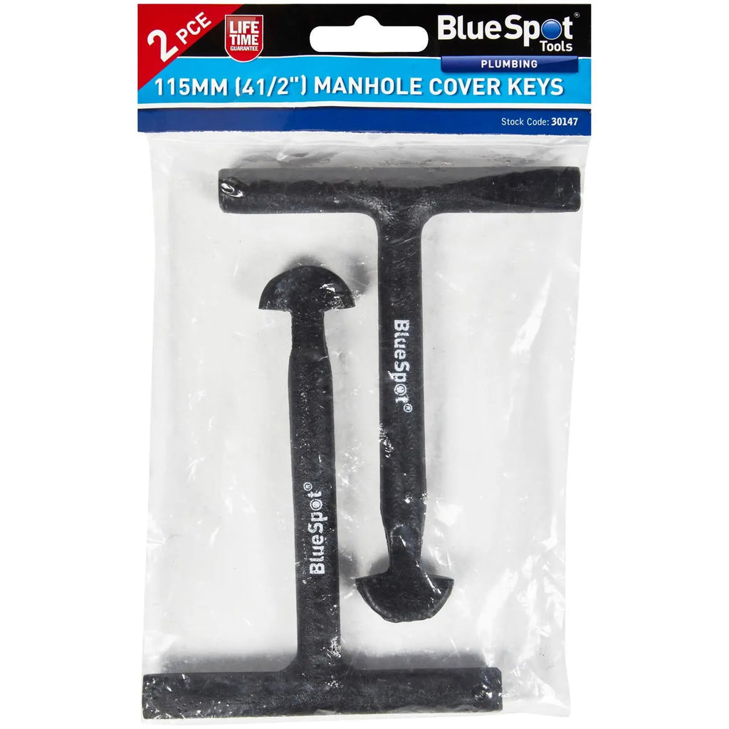 The BlueSpot Tools 2 PCE 115MM (4 1/2") manhole cover keys are manufactured from cast iron for increased durability with a powder coating to protect against corrosion.