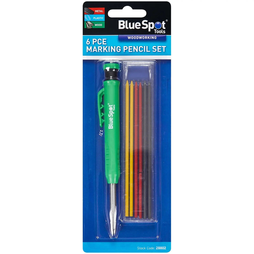 The BlueSpot Tools marking set is ideal for marking wood, metal, plastic and most common materials on both surfaces and deeper holes. Simple push button for extending the lead and push and hold the button for retracting and replacing the lead. Can be fully extended to mark depths of up to 100mm. This set includes a small twist out sharpener and a robust extendable/retractable marking pen with 6 PCE 120mm replacement leads. 2 x yellow, 2x red and 2 x black. Durable metal and ABS plastic construction for increased durability with a pocket clip for easy storage and transportation.