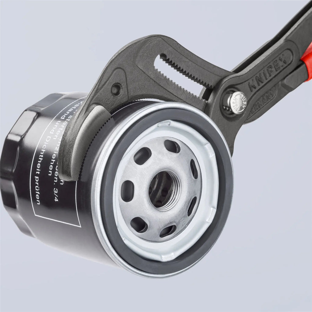 Fine adjustment for ideal adjustment to diverse diameters. For siphons, oil filters, plastic pipes and connectors up to 80 mm diameter. Robust, heavy duty. Ideal for tightening and loosening siphon screw connections, plastic pipe fittings and round union nuts. For connectors and couplings with screw connection, such as Cannon circular connectors. For gentle loosening of hoses on nozzles and filter cartridges. Optimum adhesion on dirt-, oil- and fatfree surfaces. 25-way adjustable box joint. Ergonomic handle geometry. with serrated gripping jaws; up to Ø 80 mm. self-service card/blister.