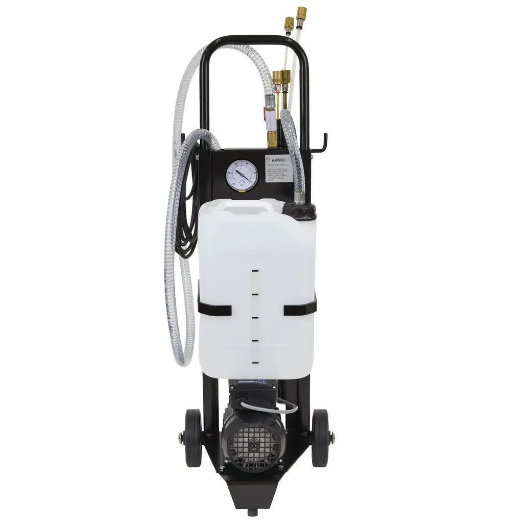 Mobile oil drainer designed to extract oil via the dipstick tube.