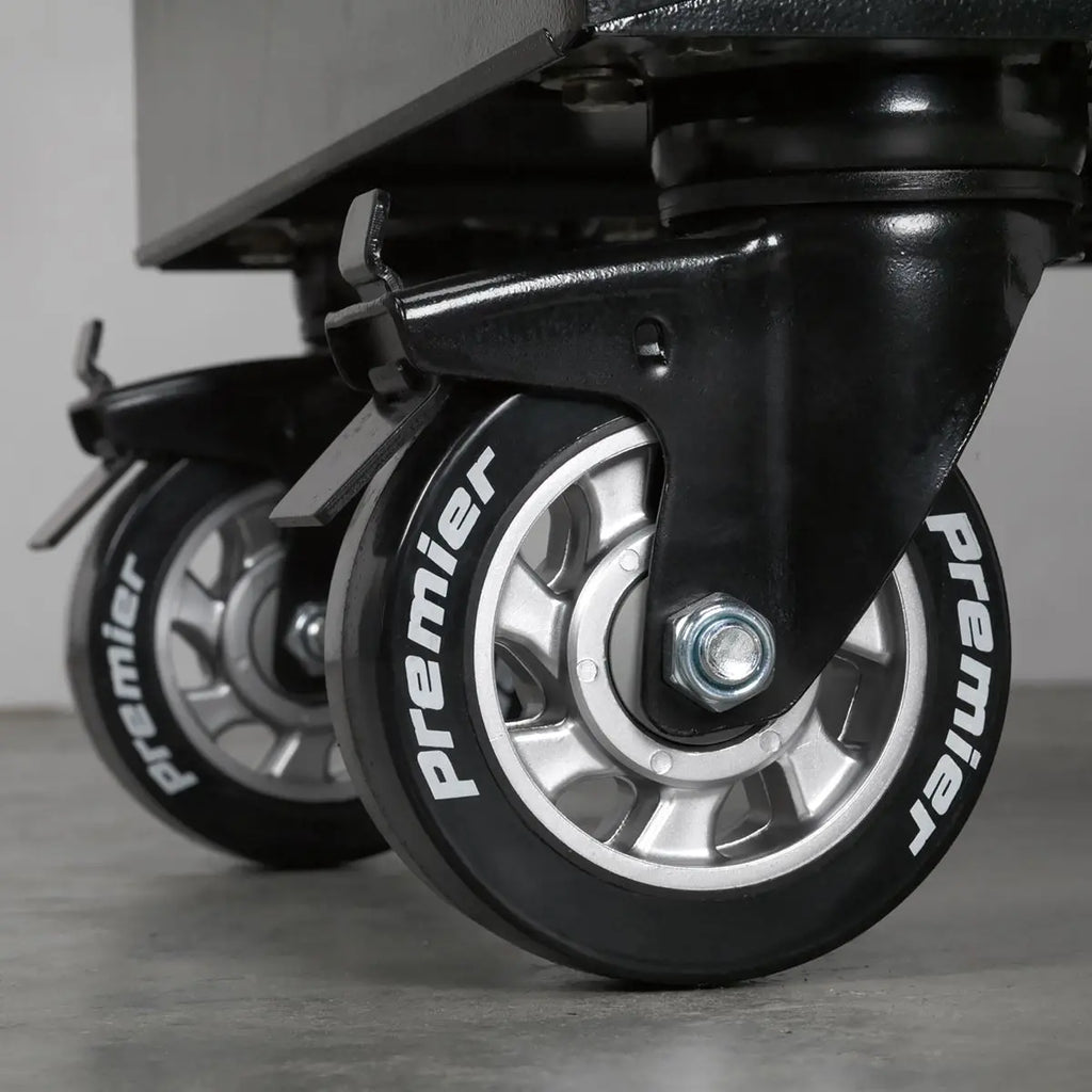Heavy-duty Ø125mm Mag style castors, four swivel with toe brakes and two fixed on rollcabs.