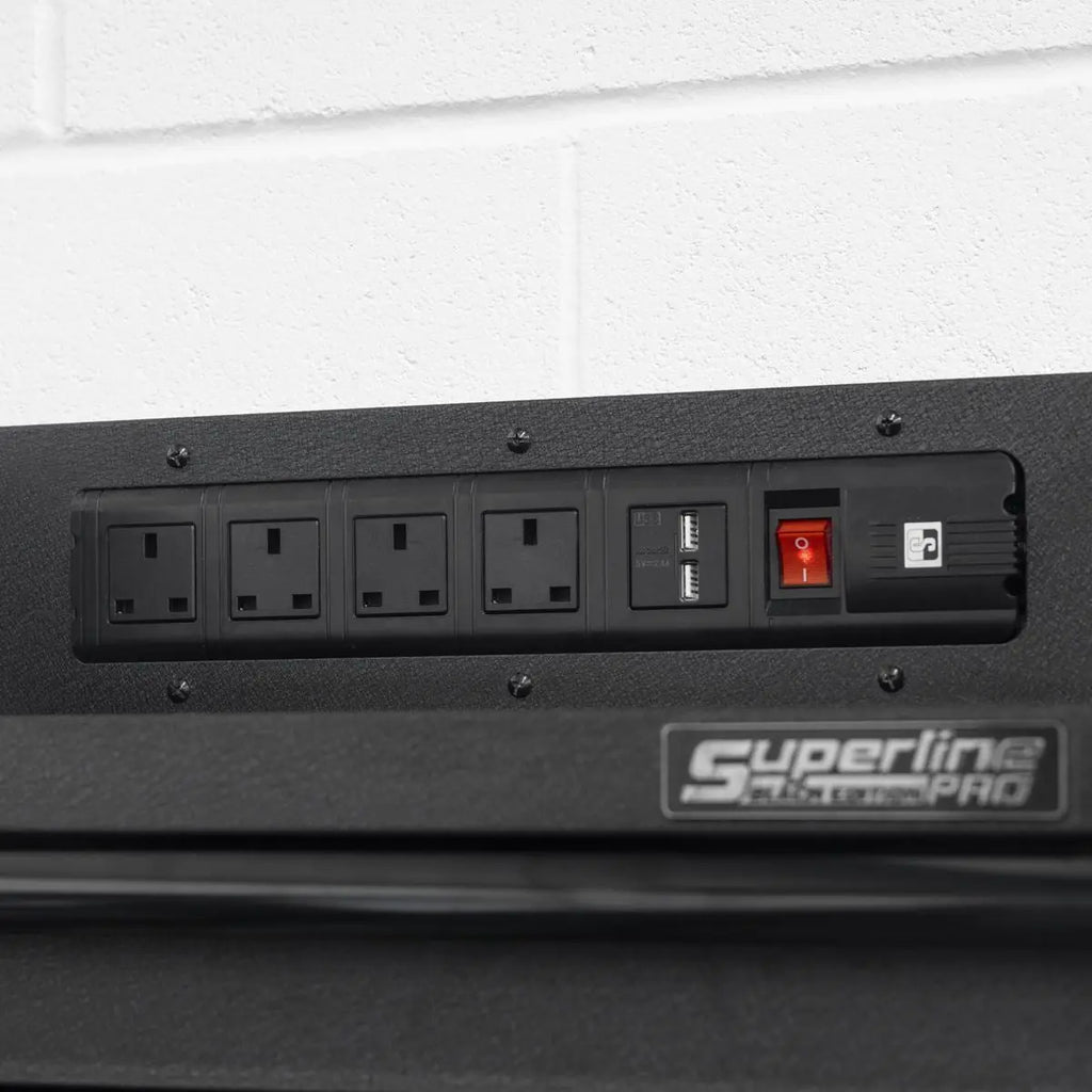Power bar fitted with 4x 230V, 1 x USB-C and 3 X USB.