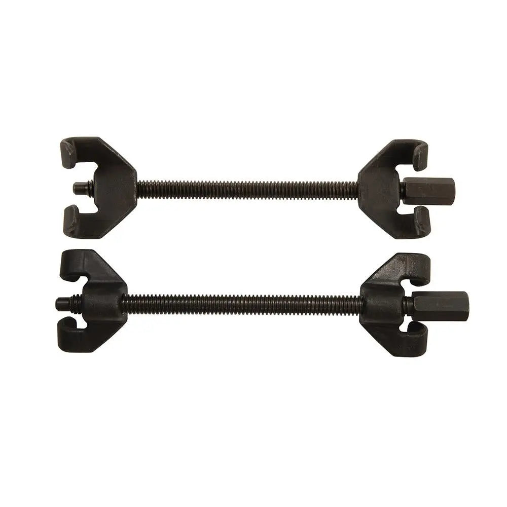 Hardened carbon steel spring compressors for fitting and removing shock absorbers. Electroplated rust-resistant black phosphate finish. Sliding and threaded jaws for quick positioning. Coarse thread prevents stripping. 1/2" drive or 22mm hex compatible. 300mm capacity.