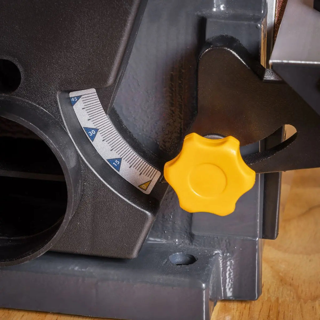 ADJUSTABLE - The sanding belt can be used in a vertical or horizontal position or at any other angle in between. The sanding disc table can be tilted to any angle up to 45° and is supplied with a mitre gauge for accurate angle sanding.