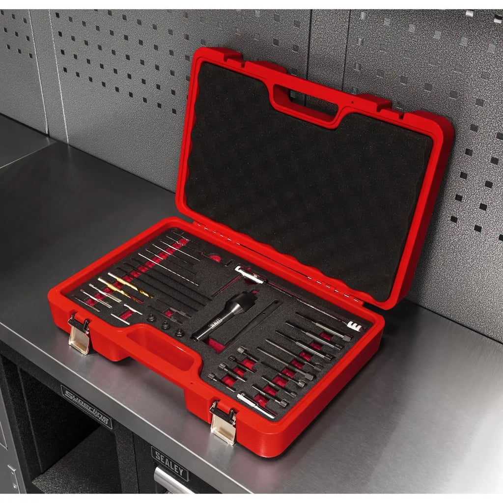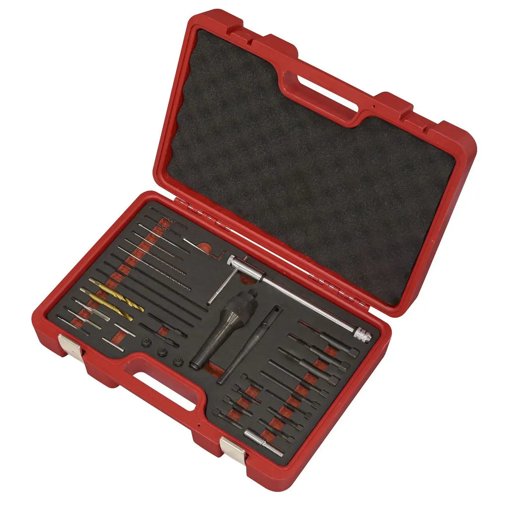 • Contents: Drilling/Tapping Guides; M8 x 1, M10 x 1, M10 x 1.25mm, Extraction Adaptors; M8 x 1, M10 x 1, M10 x 1.25mm, Tap & Threaded Rod Sizes; M3 x 0.5, M4 x 0.7mm, Drill Ø; 2.5, 3.3mm, Taps; 1/4NF28, M8 x 1, M10 x 1mm, Glow Plugs; M8 x 1, M10 x 1mm