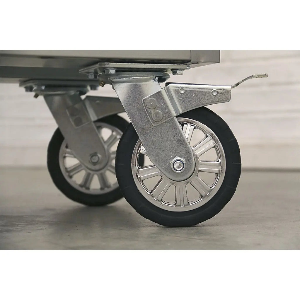 Four large castor wheels, two fixed and two swivel, that include brakes.