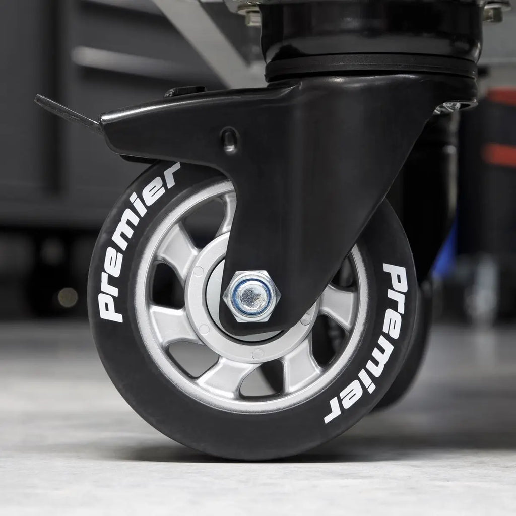 Heavy-duty Ø125mm Mag style castors, two swivel with toe brakes and two fixed on rollcabs.