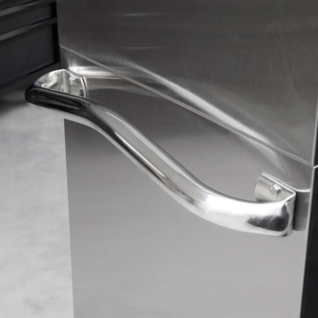 All drawers have full width sand blasted aluminium 'Lift & Latch' drawer pulls, making easy-access while preventing inadvertent opening when box is being moved.