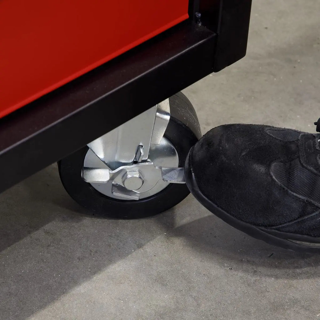 Six large castor wheels (four swivel and two fixed) that include brakes.