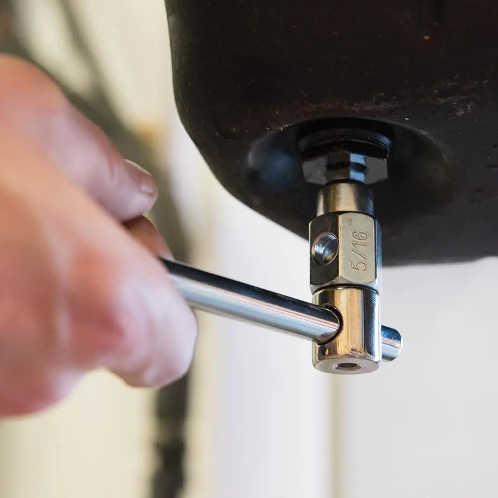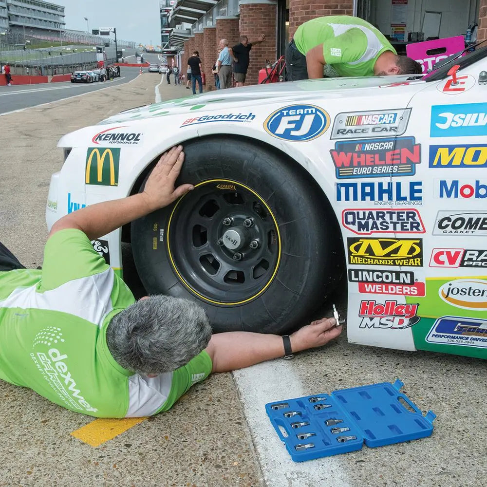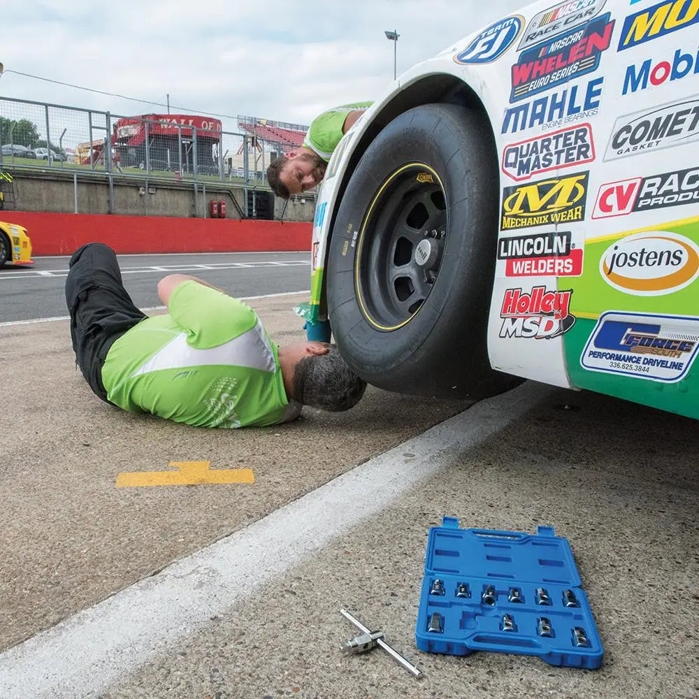 - Includes carbon steel sliding T-bar; hex: 3/8", 8, 9, 10, 12, 14 & 17mm sockets;
