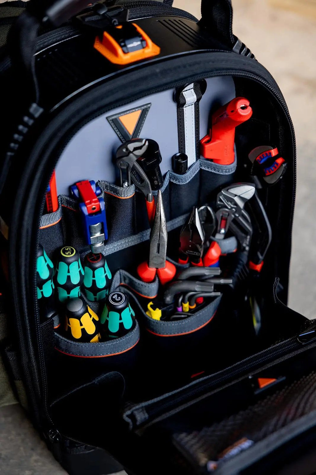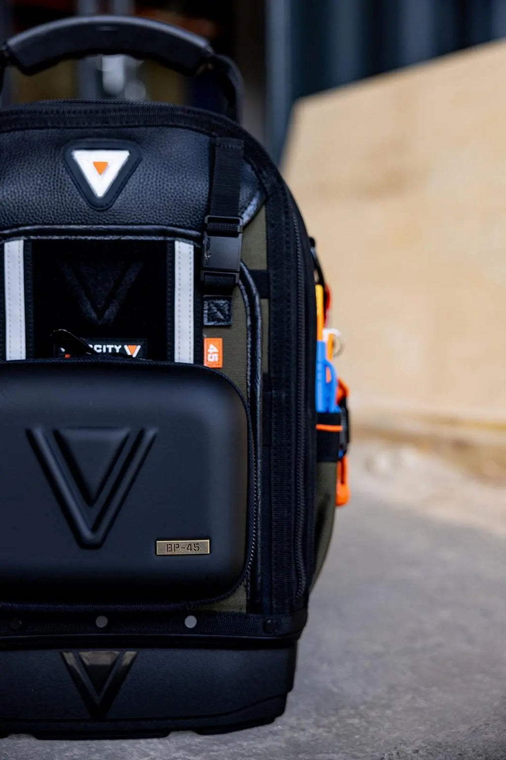 The Rogue 45 is stacked to the gills with features to make your life on site easier. From the 20 vertical tool pockets and two pouches in the main compartment, to the removable tool pouch and velcro tool set holder in the rear. The Rogue 45 was designed to be your lightweight, go-to tool bag for years to come, from the top fidlock to take the load off the shoulder straps, to the moulded base to keep your bag & tools safe on site.