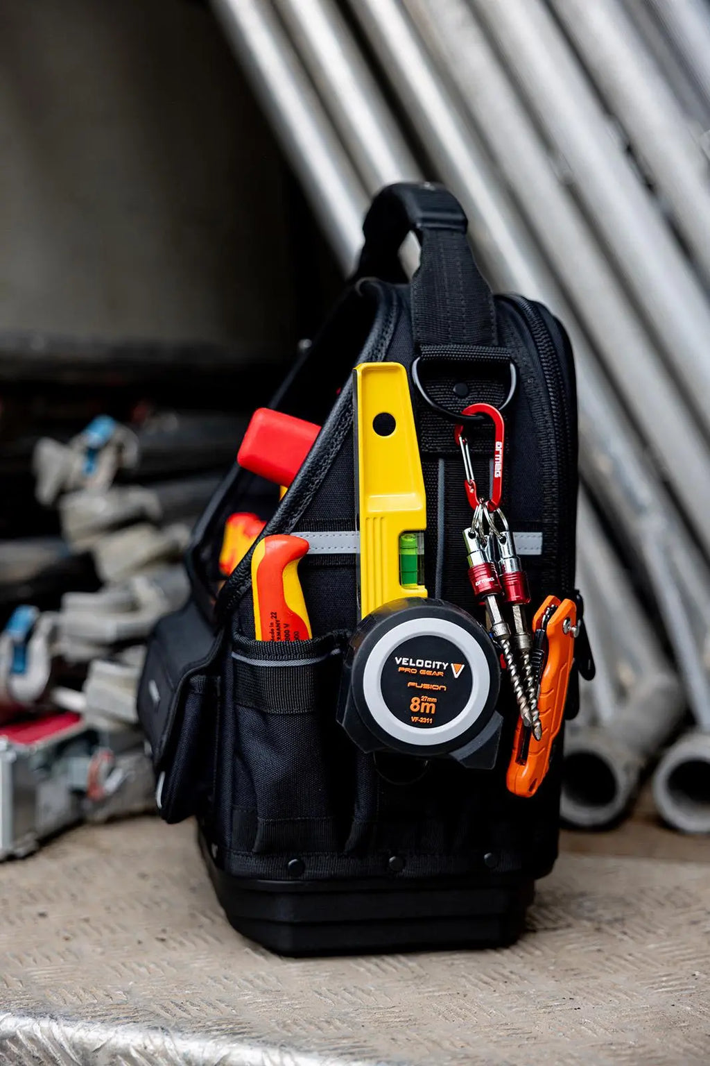 • Open front tote with multiple vertical tool pockets for efficient organisation. Internal & external vertical pockets