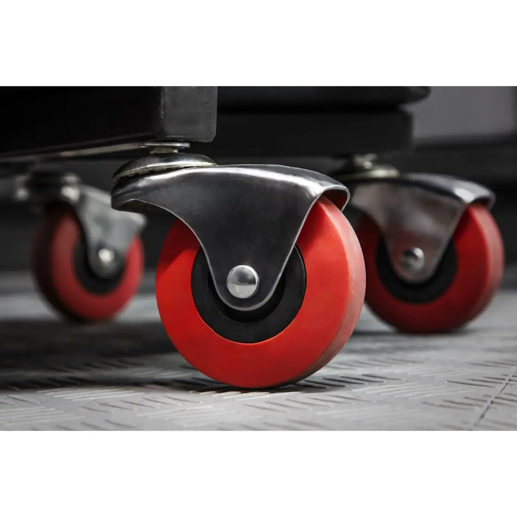 Seat glides across workshop floor on five Ø60mm ball-bearing castors.