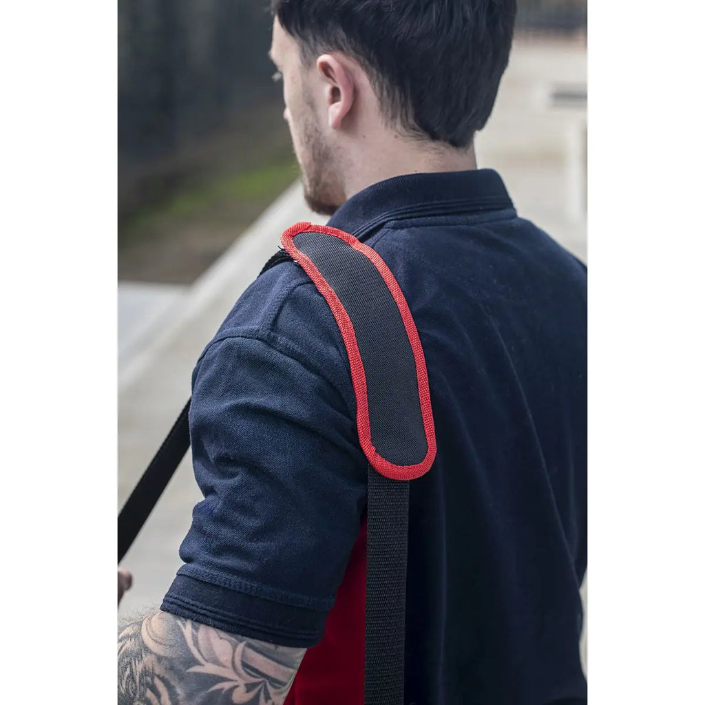 Adjustable shoulder strap and metal carry handle with foam padding.