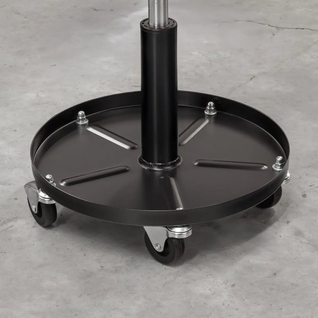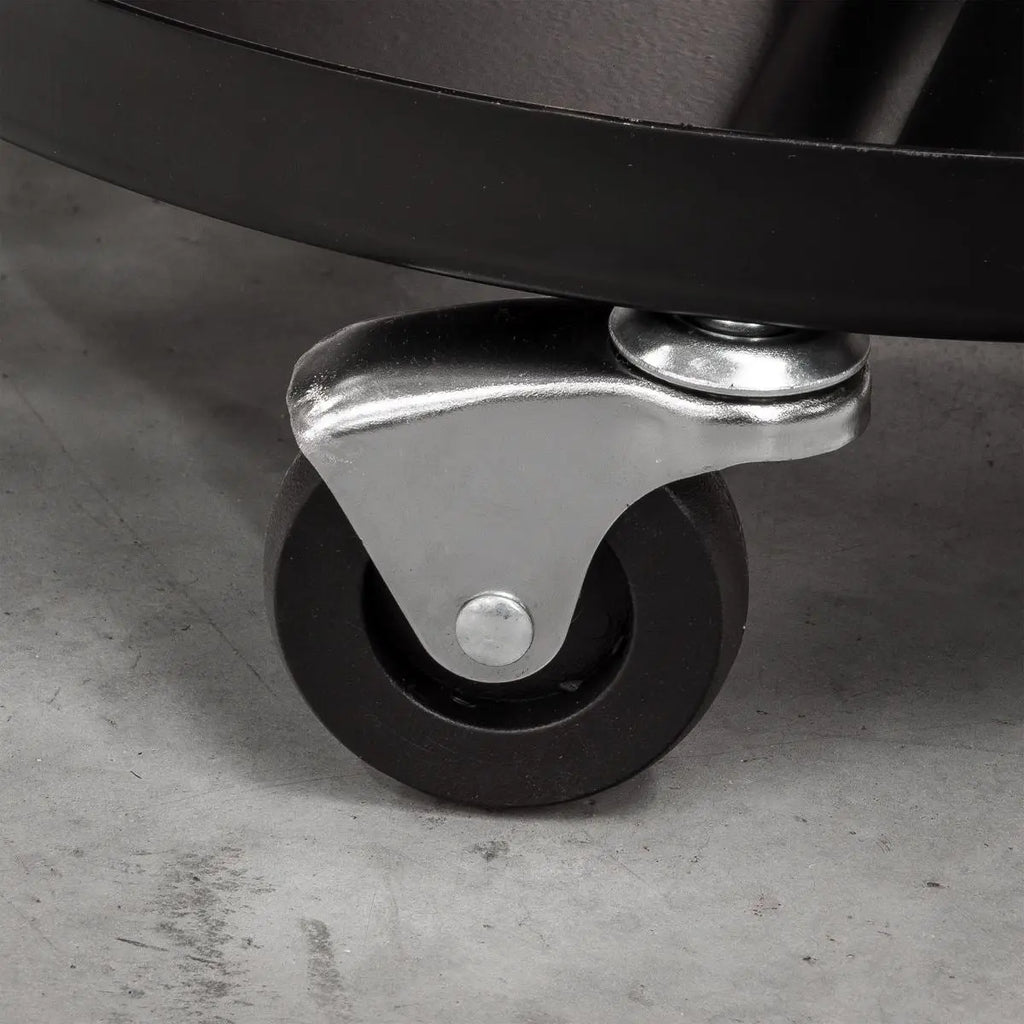 Seat glides across workshop floor on five Ø60mm ball-bearing castors.