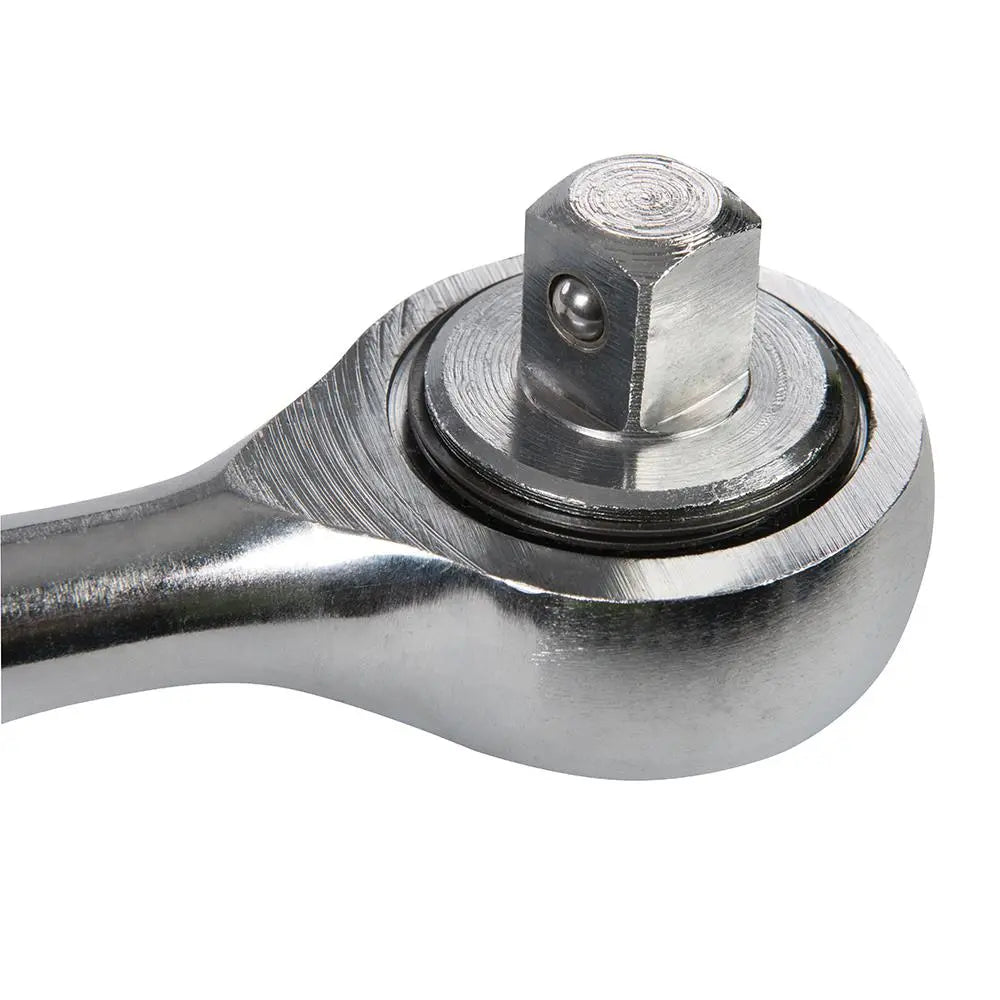 Chrome-plated, 3/4" set with single-piece, forged ratchet handle with knurled grip and reverse direction lever. Powder-coated steel box. Includes 12 x 12 point sockets: 22, 24, 26, 27, 28, 30, 32, 33, 36, 38, 41 and 46mm, T-bar and 200mm extension bar.