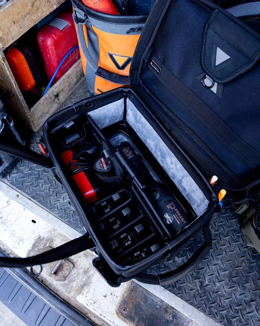 Finished in Shadow Black with rubber trim and detailing, this is the ultimate press tool bag — where protection meets professional style.