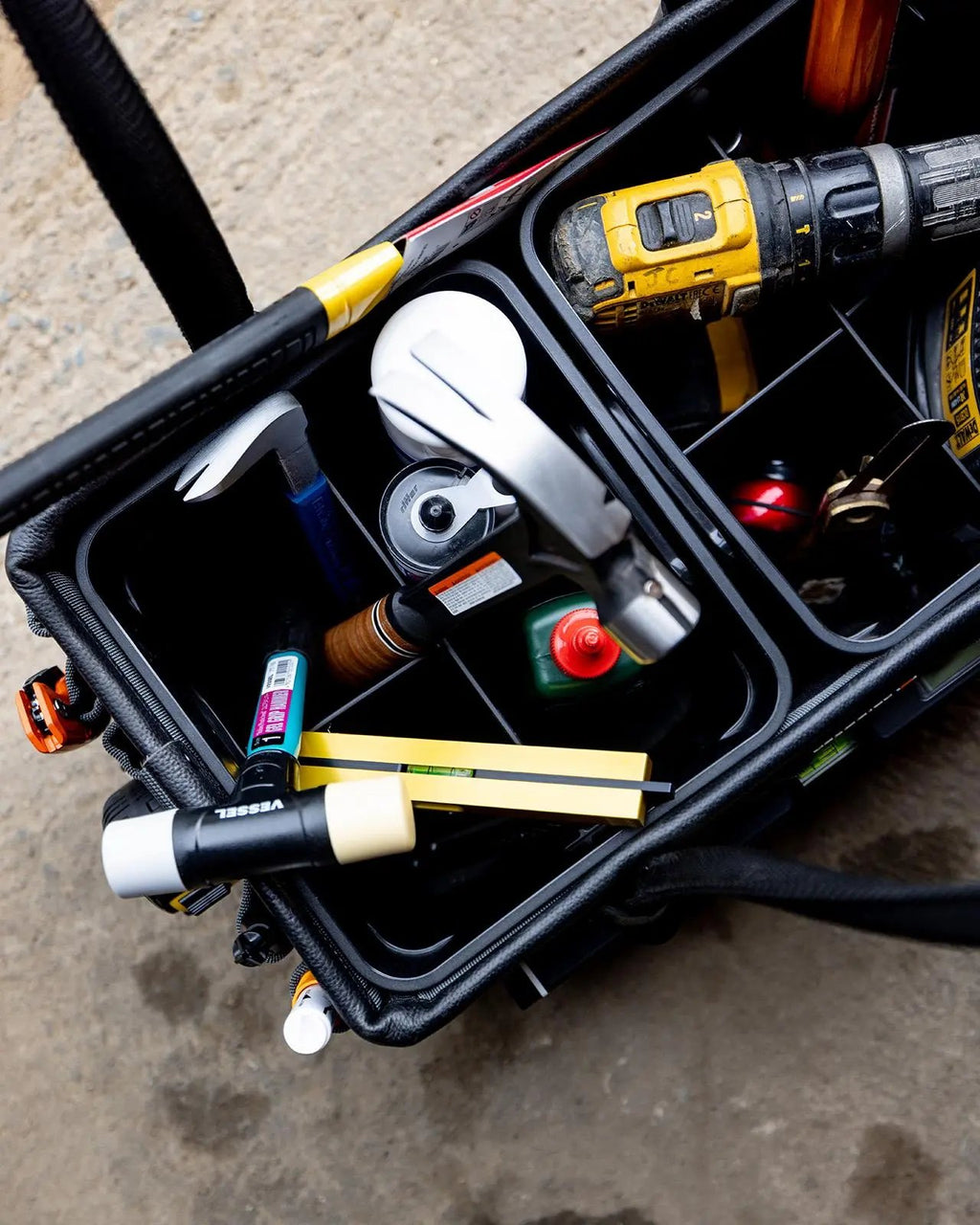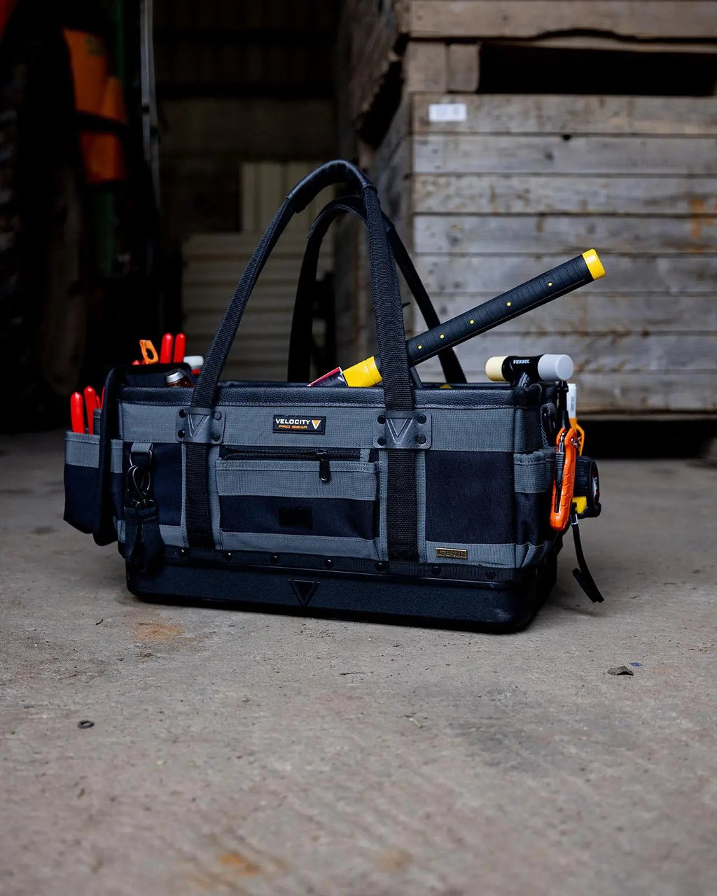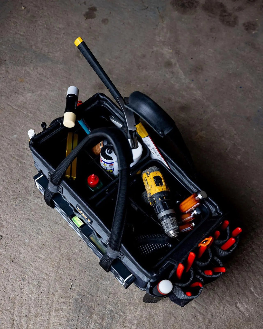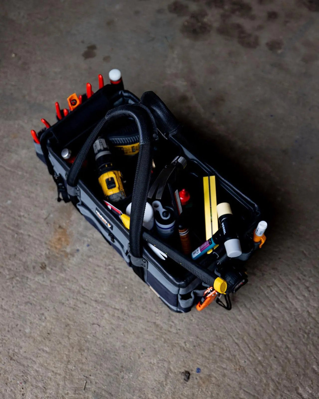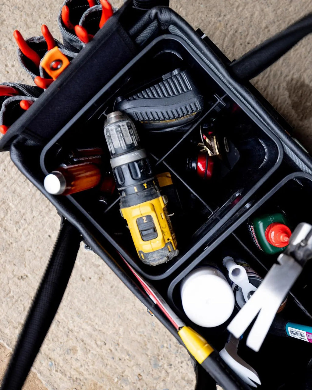 The ROGUE 11.0 Contractors Bag is designed for trades and professionals of all kinds. With leather carry handles and an adjustable carry strap, it offers premium portability for tools and sundries. The waterproof polycarbonate base and central divider ensures secure storage and organisation while external pockets and a large removable plastic carry bucket provide additional storage for multiple tools or consumables. A perfect addition to any professional's toolkit for many trades such as Plumbers, Builders, Tilers, Electricians, Carpenters, Decorators, Landscapers and many more.