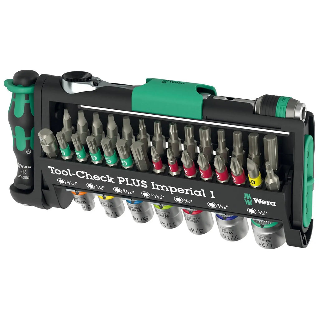 Tool-Check PLUS Imperial 1, 39 pieces 1x 8001 A Bit Ratchet ¼": 1/4" x 87 mm 1x 889/4/1 K Rapidaptor Universal Bit Holder: 1/4" x 50 mm 1x 813 Bitholding screwdriver: 1/4" x 78 mm 1x 870/1 Adaptor: 1/4" x 25 mm 6x 851/1 BTZ bits: 2x PH 1x25 mm, 3x PH 2x25 mm, PH 3x25 mm 6x 867/1 BTZ TORX® bits: TX 10x25 mm, TX 15x25 mm, TX 20x25 mm, TX 25x25 mm, TX 30x25 mm, TX 40x25 mm 5x 867/1 Z TORX® BO bits with bore hole: TX 10x25 mm, TX 15x25 mm, TX 20x25 mm, TX 25x25 mm, TX 30x25 mm 1x 800/1 BTZ bits: 1 x 5.5 x 25 mm 5x 840/1 Z bits: 3/32"x25 mm, 1/8"x25 mm, 5/32"x25 mm, 3/16"x25 mm, 1/4"x25 mm 5x 868/1 Z Square-Plus bits: # 1x25 mm, 3x # 2x25 mm, # 3x25 mm 7x 8790 HMA Zyklop 1/4" socket: 3/16"x23 mm, 1/4"x23 mm, 5/16"x23 mm, 11/32"x23 mm, 3/8"x23 mm, 7/16"x23 mm, 1/2"x23 mm