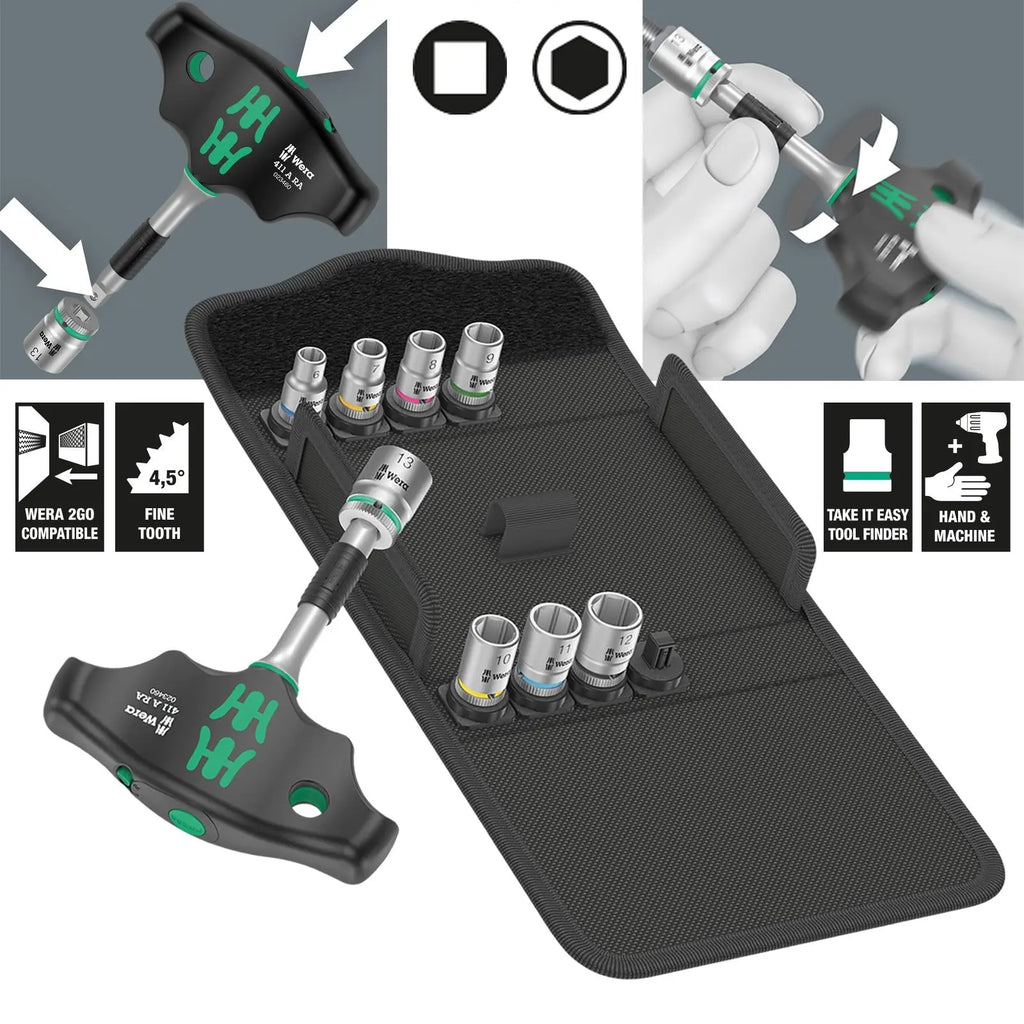 Wera T-Handle Adaptor Screwdriver 1/4" Drive with Ratchet Function 400 RA Set 2 9 Pieces 6-13mm Sockets