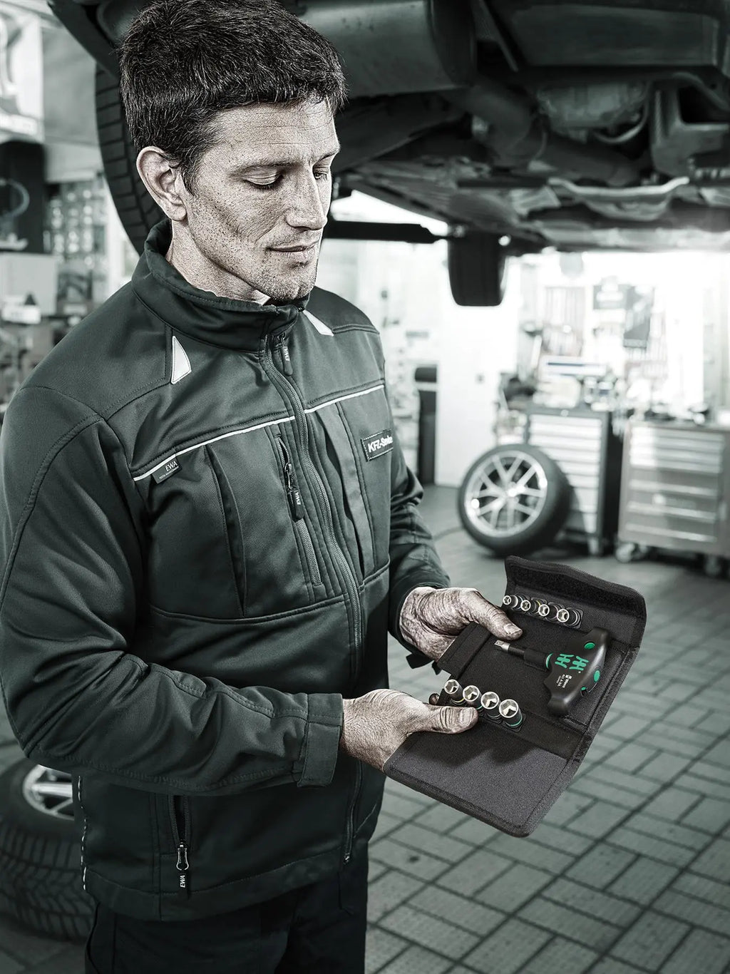 9-piece set in a robust textile box. One 411 A RA T-handle adapter screwdriver with ratchet function for 1/4" sockets. The integrated ratchet with fine toothing (80 teeth/return angle 4.5°) eases and accelerates screwdriving without having to reposition the tool. The ratchet mechanism completely embedded in the handle ensures very handy and comfortable work. With reversing lever for comfortable clockwise/counterclockwise direction change in one-hand operation. The ergonomic shape of the handle fills the ball of the hand well, the fingers lie securely in the softly rounded recessed grips. The whole hand comes into contact with the handle, friction loss between hand and handle is avoided. For 1/4" sockets as well as 1/4" connectors with square head drive, with ball lock. 8 Zyklop sockets with 1/4" drive. "Take it easy" tool finder: With colour coding by size - for quick and easy identification of the required tool