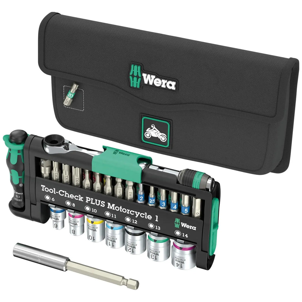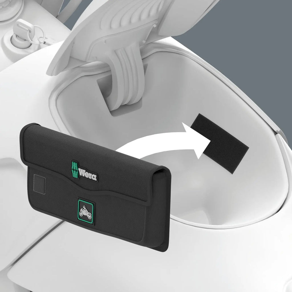 40-piece compact workshop to go. For common screwdriving applications on motorcycles. With practical pouch (hook and loop fastener system). The sewn-in magnet on the front secures screws and bits - no risk of losing them! Two extra compartments for additional tools and small parts. The pouch can be hung on the motorcycle frame via the flexible hook and loop part on the back. Included are one bit ratchet (1/4") in a drop-forged solid steel design; with fine toothing mechanism (60 teeth) for a small return angle of 6° for precise working. Easy clockwise/counterclockwise switching. 1/4" sockets can also be used with the Wera 870/1 adapter (1/4" external hexagon to 1/4" external square head) included in the set. 7 Zyklop sockets (1/4") for manual and machine-operated tools; with ball stop groove. Knurling at the rear end for manageability during manual screwdriving. With Take it easy tool finder: colour coding by size to help you find the required tool quickly and easily. Made of matte chrome-plated chrome-vanadium. One Kraftform handle with 1/4" bit mounting, one 889/4/1 K bitholding screwdriver with Rapidaptor quick-release chuck, magnetic, one extension (100 mm) for bits with 1/4" external hexagon drive. 28 bits, 18 of which (Phillips, TORX®, hexagonal socket, slotted) in BTZ design with BiTorsion zone (prevents the bit from breaking prematurely) and Take it easy tool finder: colour coding by profile and size), one bit (TORX®) with torsion zone for longer service life (TZ), 9 bits (hexagonal socket, hexagonal socket with ball head) in tough design (Z) for universal use. The tools are stored and neatly arranged in the Tool-Check and secured by the green locking components.
