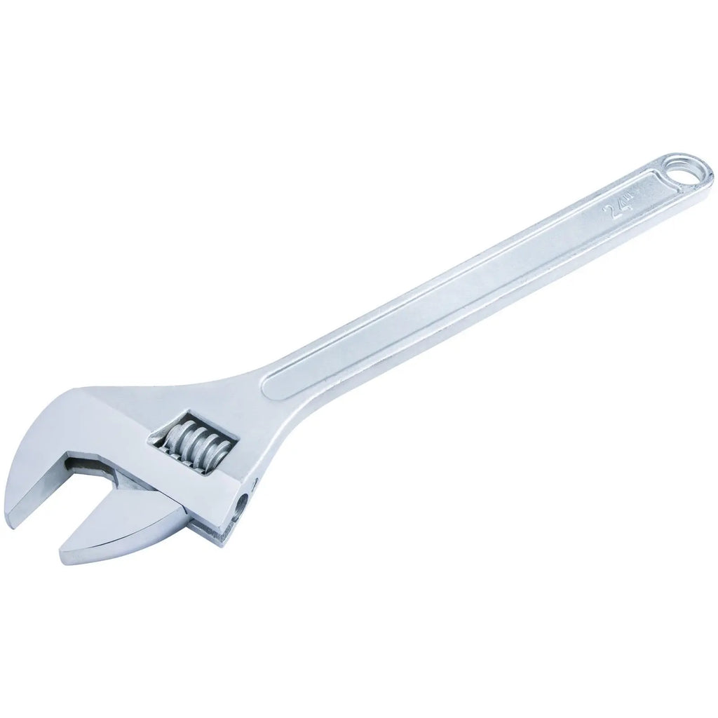 The BlueSpot Tools 600mm (24") Adjustable Wrench is manufactured from drop forged, heat-treated carbon steel for strength and durability. The wrench is chrome plated to protect against corrosion and for a high shine finish. An extra-long handle helps tackle especially tough jobs where more torque is required. The jaw design allows a better fit and the knurled wheel makes adjustments easy. The wrench can be adjusted to 62mm.