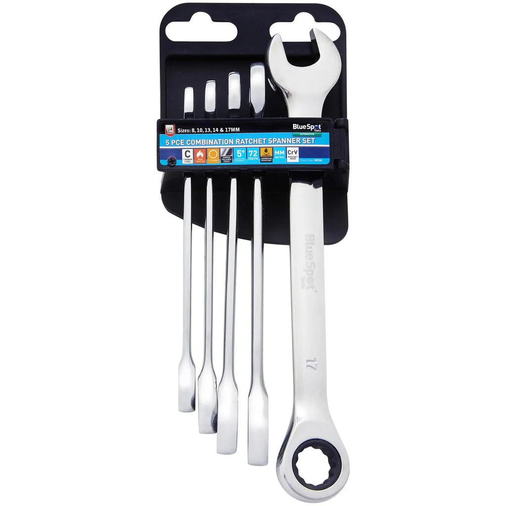 The BlueSpot Tools 5 PCE combination ratchet spanner set (8-17mm) is manufactured from heat treated carbon steel for increased durability and features a 12 point chrome vanadium ratchet head with 72 teeth on one end and a same sized open end spanner at the other.