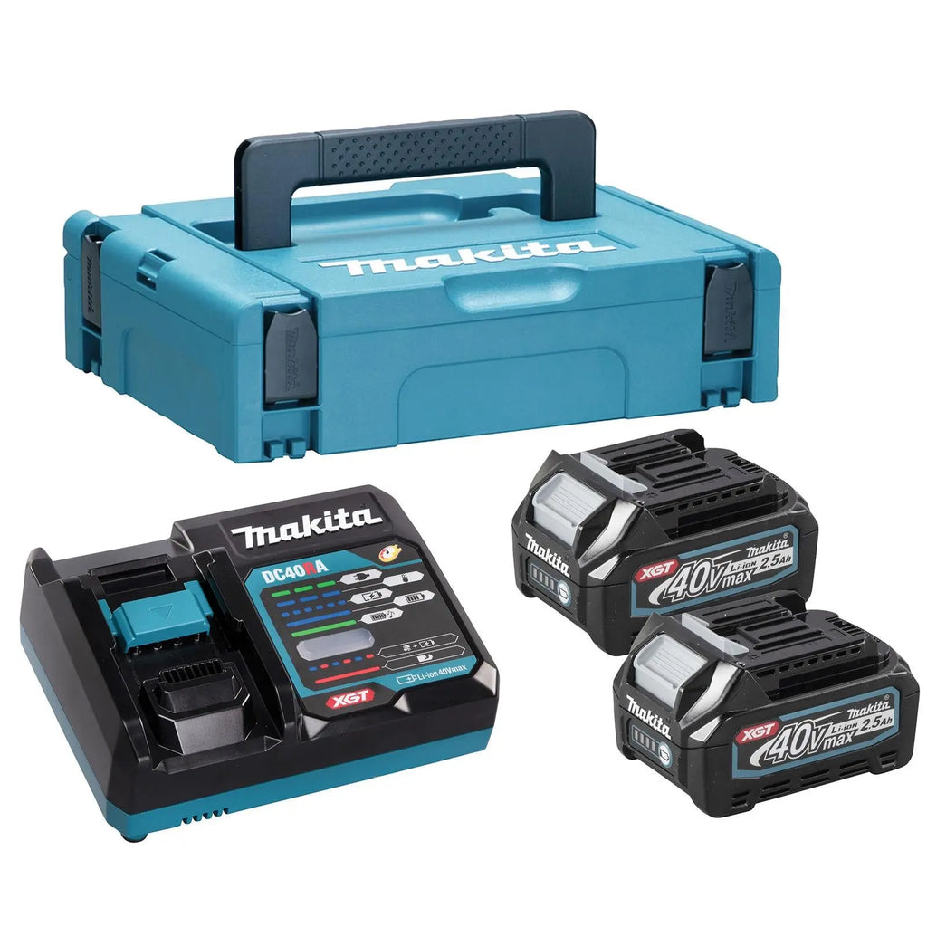 A handy power source kit for cordless XGT® 40V Max tools, containing 2 x BL4025 2.5Ah batteries, DC40RA 240V rapid charger and a Makpac type 1 case