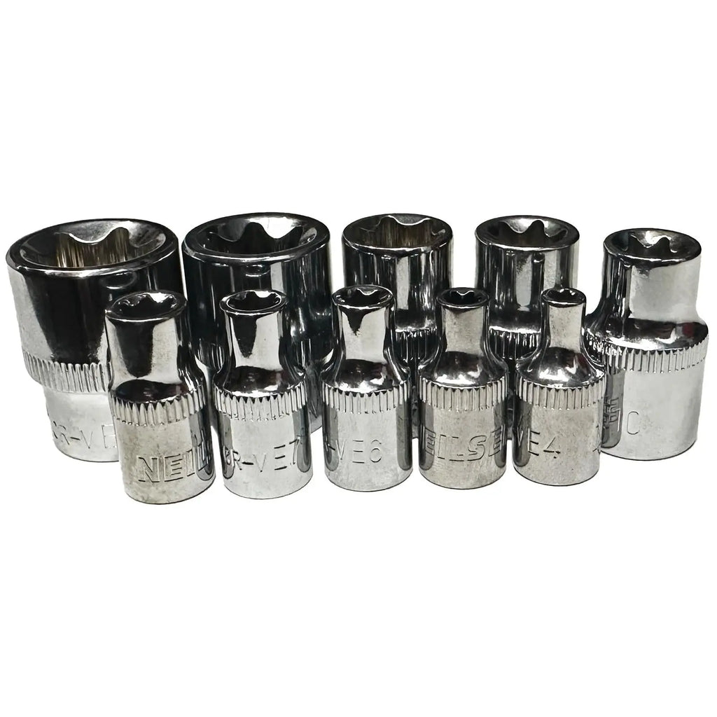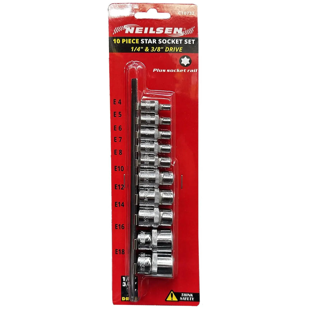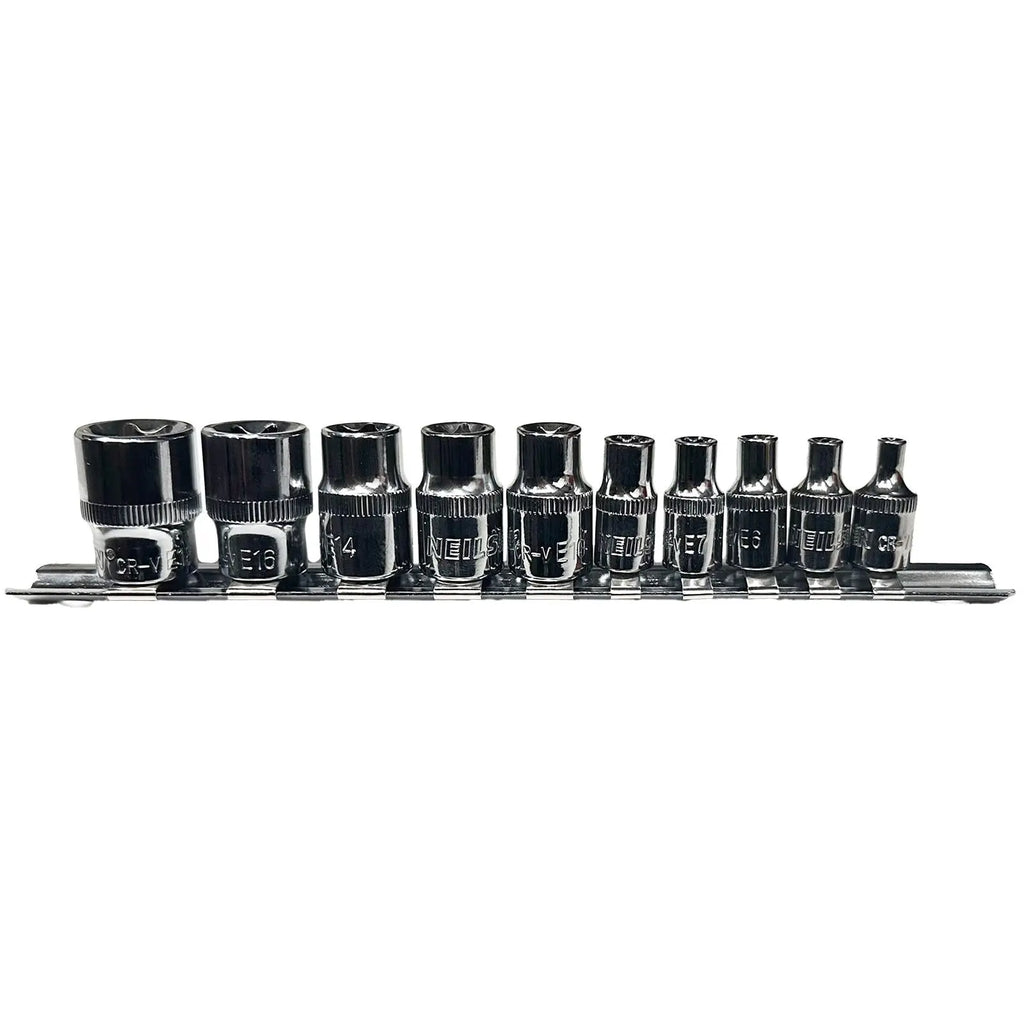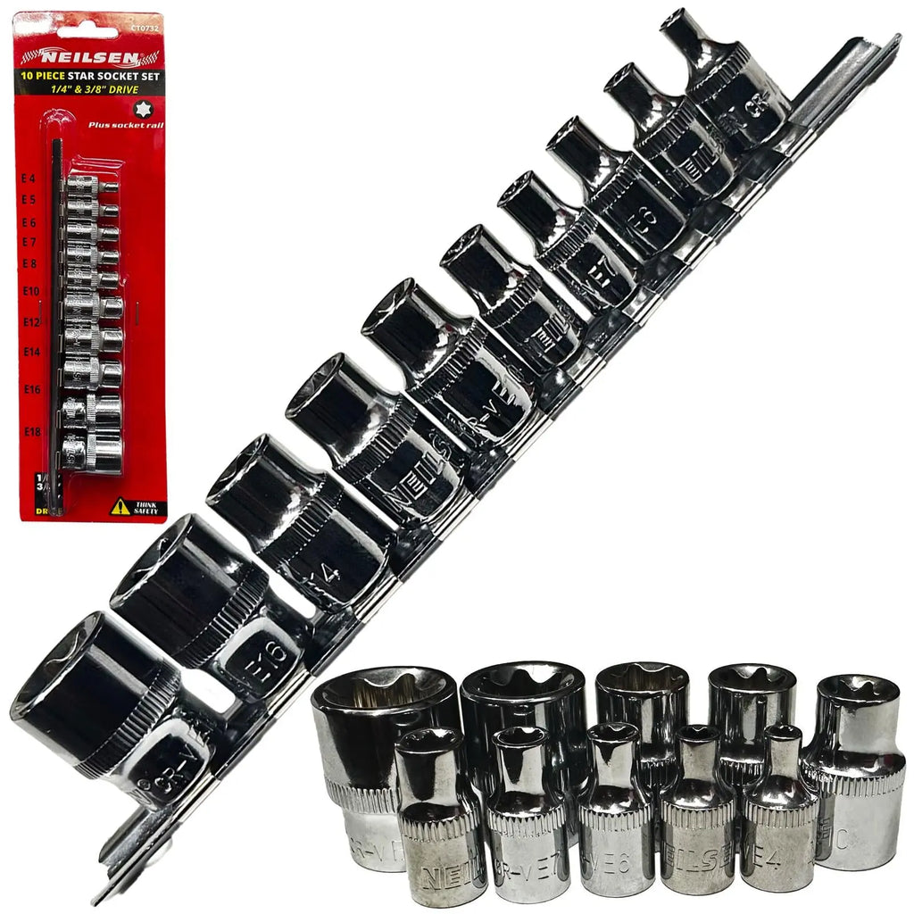 Neilsen Torx Star Socket Set Female External Socket Rail 1/4" 3/8" Drive E4-E16 10 Pieces