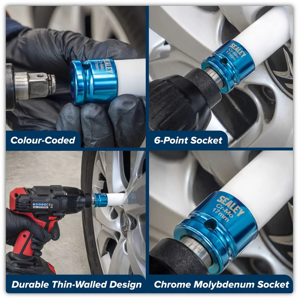 COLOUR-CODED - For easy size selection. IMPORTANT INFORMATION Alloy wheel impact sockets have an ultra-thin-walled design permitting a limited torque range. They are suitable only for wheel nuts and exempt from a lifetime guarantee.