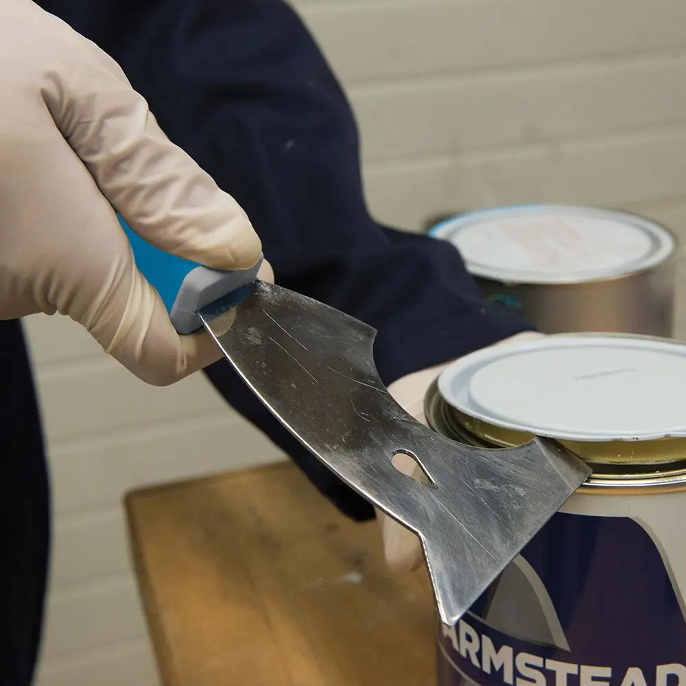 Multifunction decorating tool with corrosion-resistant spring-tempered steel blade. Includes 45° and 90° scraper blades, filling/smoothing knife, nail lever, rounded blade to clean paint rollers. Metal hammer end cap for sinking protruding nails. Hanging hole.