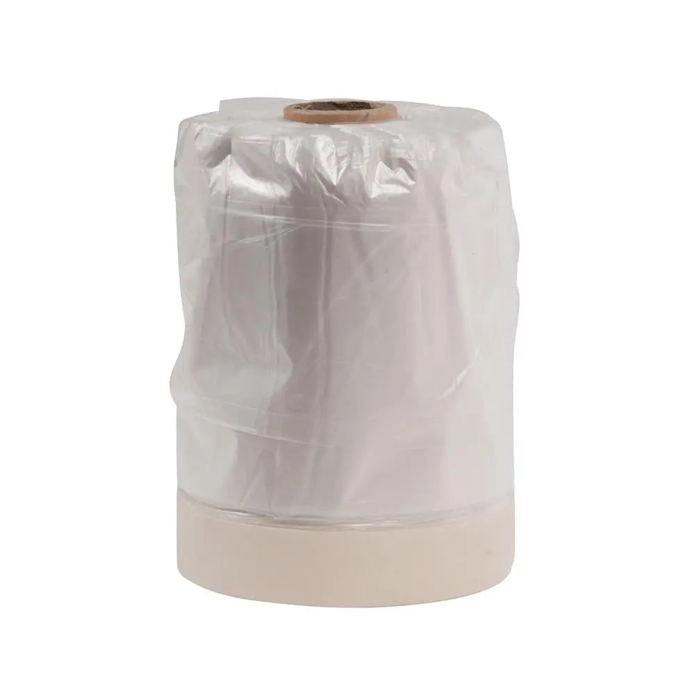 Heavy duty polythene dust sheet film. Pre-taped with strong masking tape. Ideal for protecting surfaces during decorating or DIY. Refill for Silverline Masking and Shield Tape Dispenser. Size: 550mm x 33m.