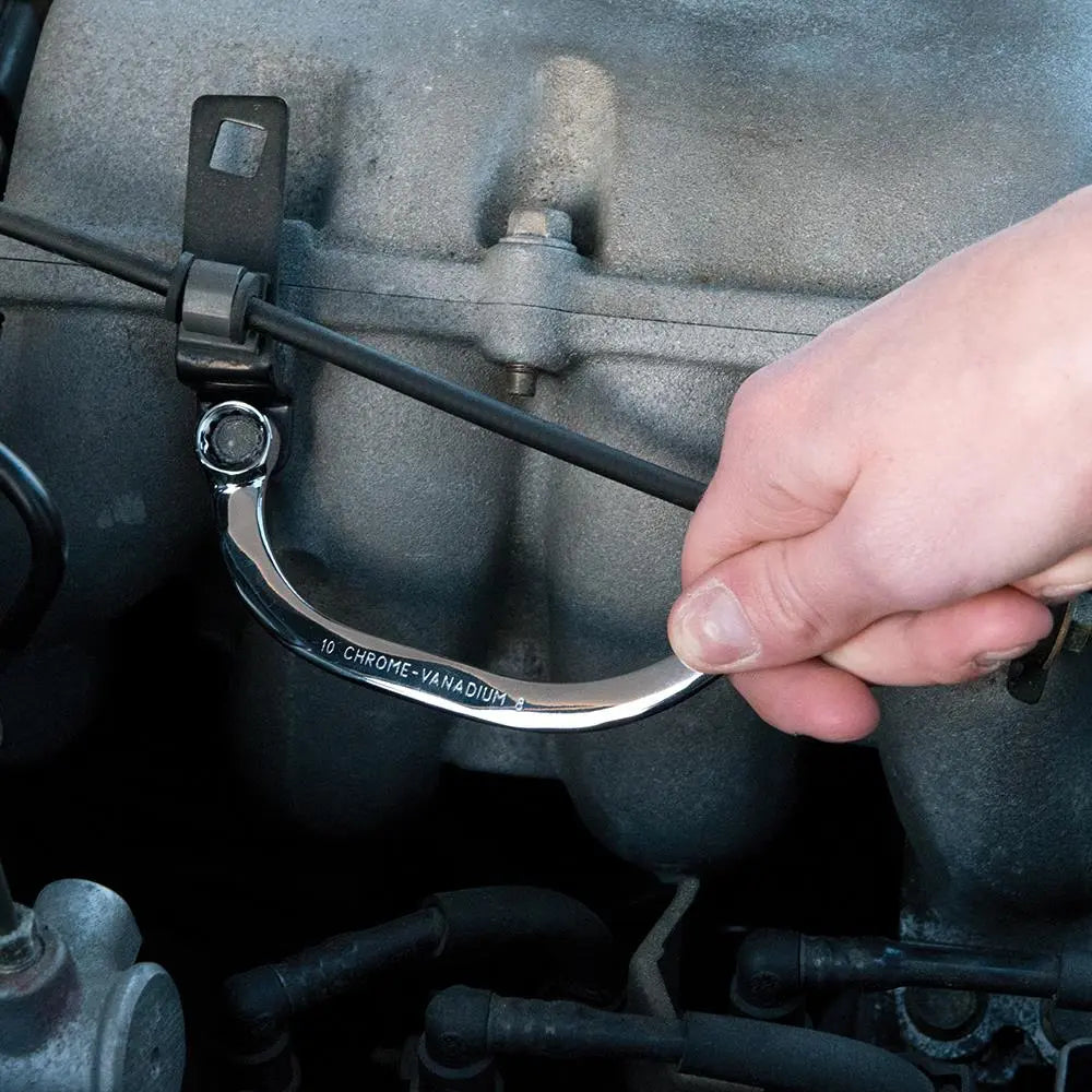 C-shaped flat profile for accessing hard-to-reach places. Hardened and tempered, drop-forged chrome vanadium. High-quality fully polished finish. Ultra-strong ballistic nylon storage roll. Includes sizes 8 x 10, 11 x 13, 14 x 15, 17 x 19, 21 x 22mm.