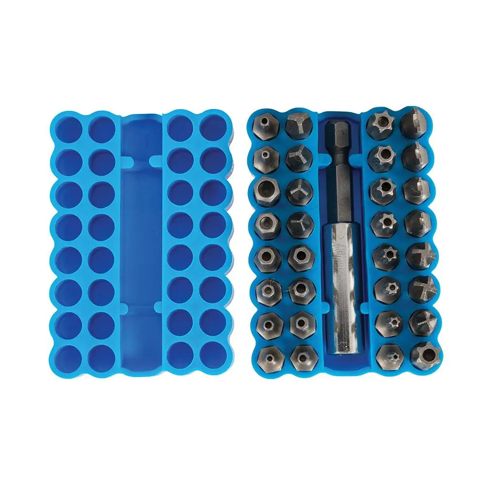 Chrome vanadium. Compatible with most tamper proof fasteners. Magnetic bit holder, torq-set bits, spanner bits, tri-groove bits, hex bits and tamper proof star bits.