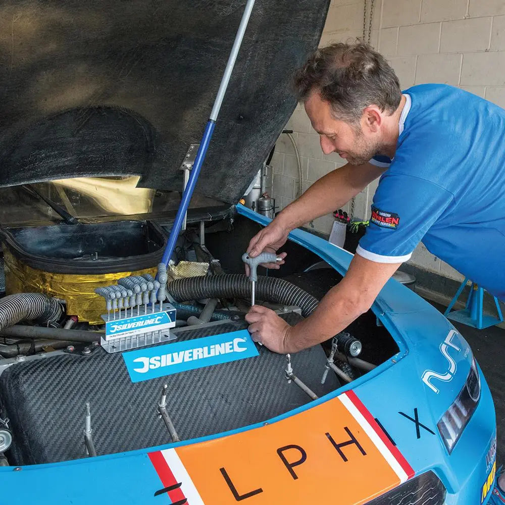 Chrome vanadium double-ended steel key set with moulded plastic T-handles and strong metal stand. Includes sizes T9 - T50.