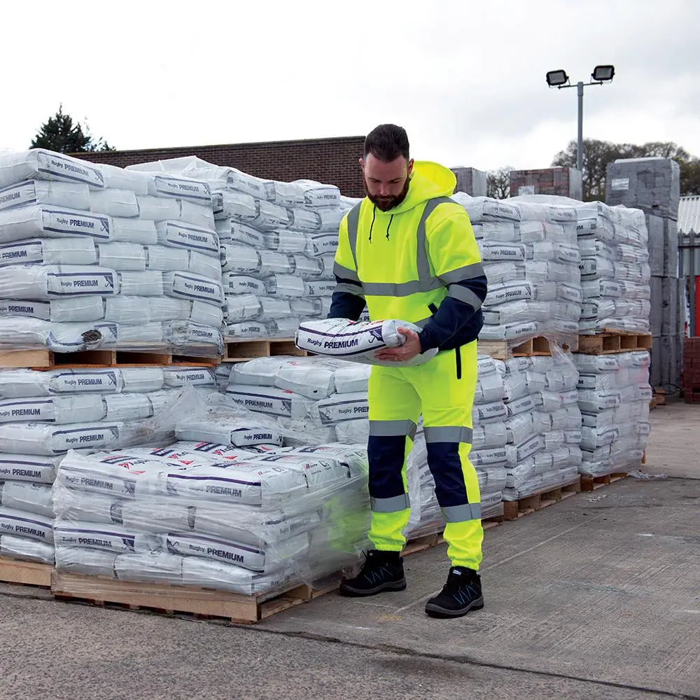 Comfy jogging bottoms in hi-vis 2-tone design with elasticated waist. Features deep hip pockets and knee patches for protection and durability. Conforms to EN ISO 20471:2013 Class 1. 100% polyester, 265gsm.
